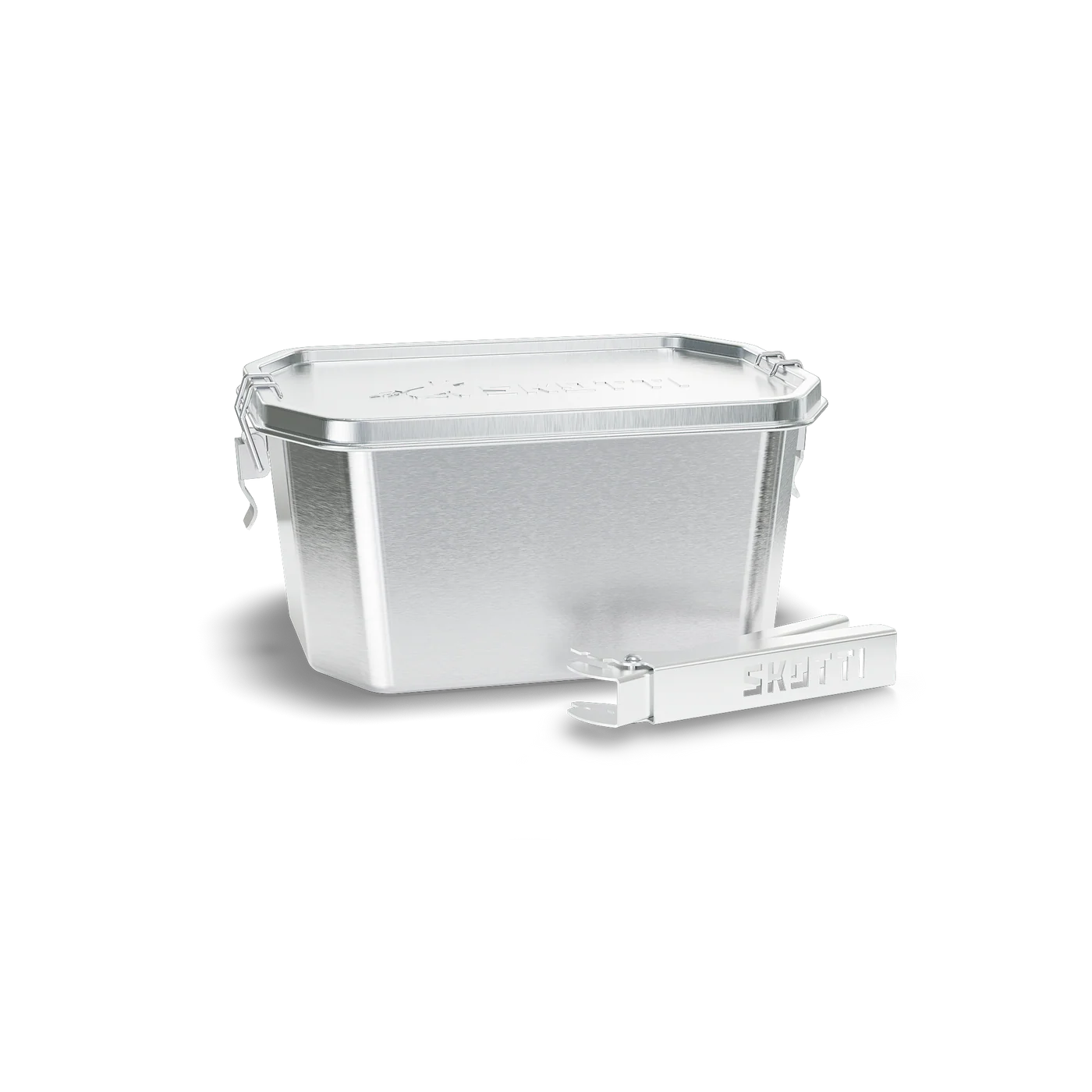 Box, 2,5 ltr., úr ryðfríu stáli með þéttu loki. Með boxinu fylgir töng til að geta notað boxið yfir hita.