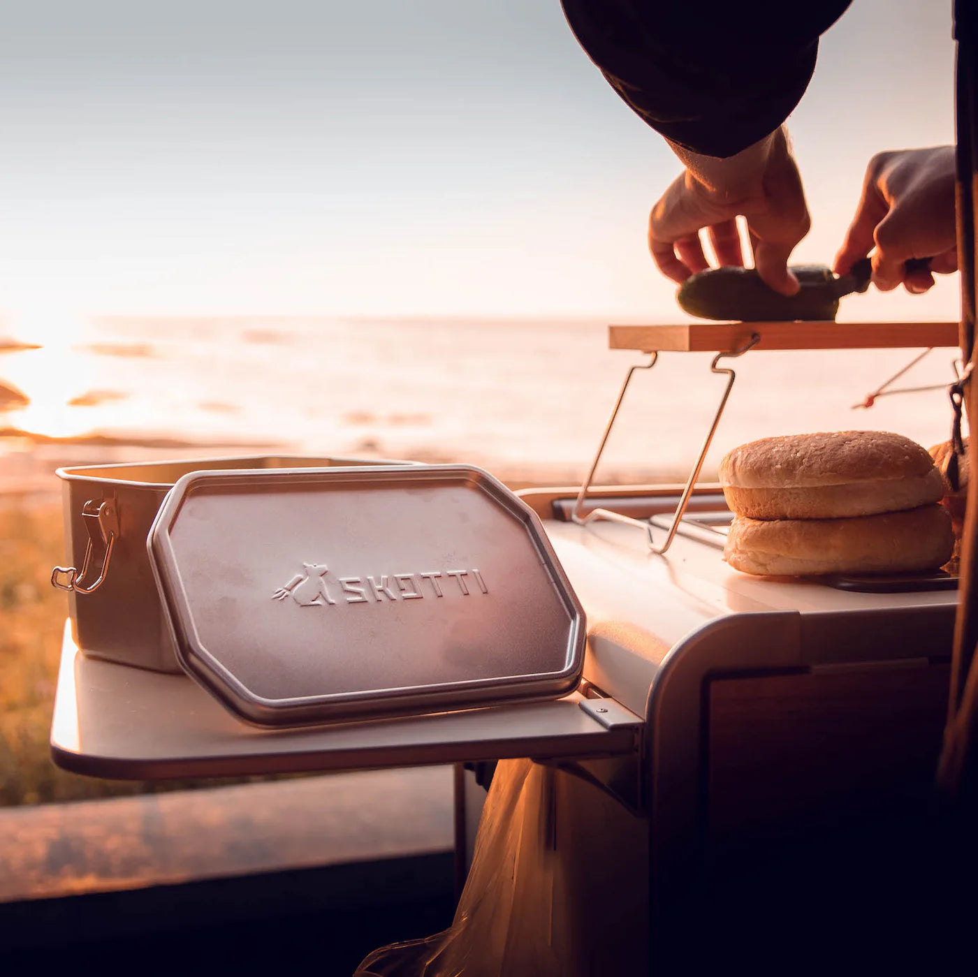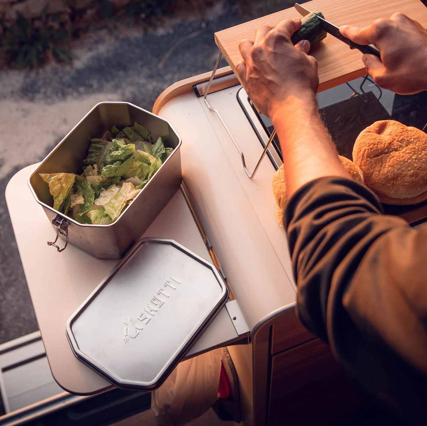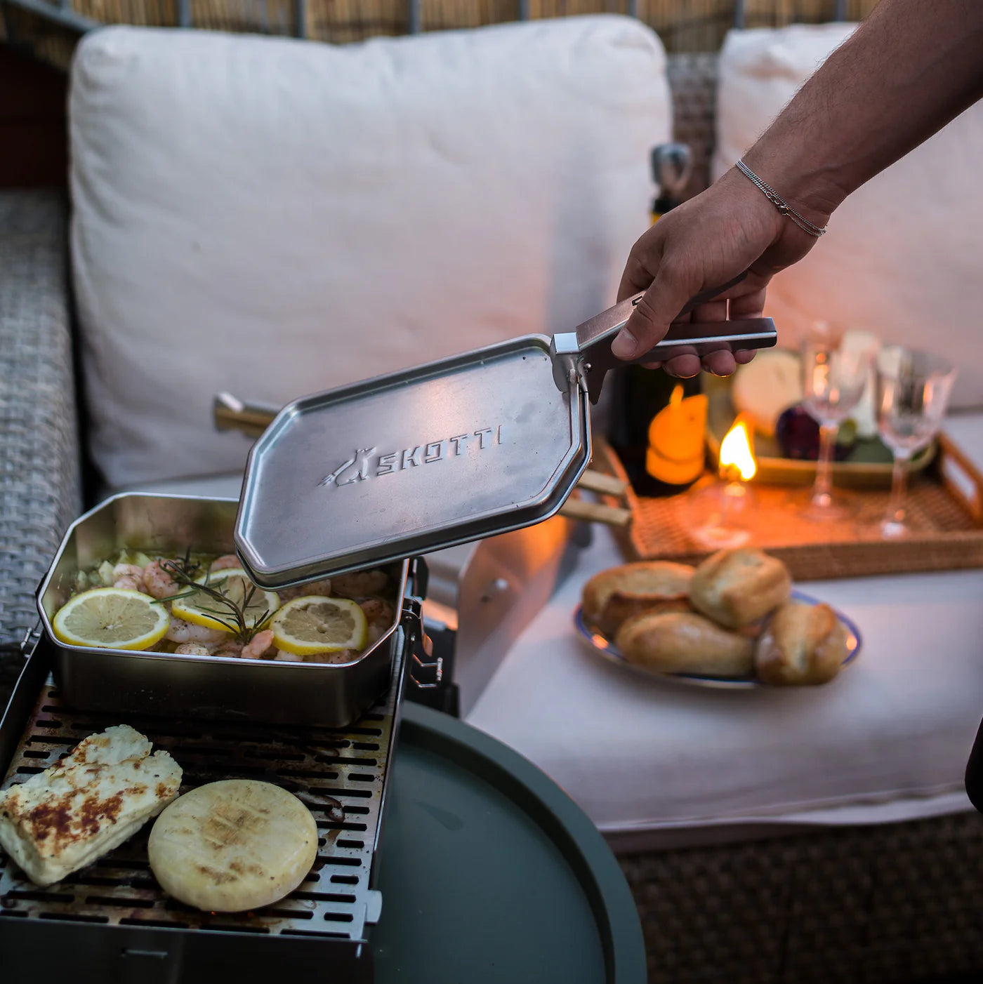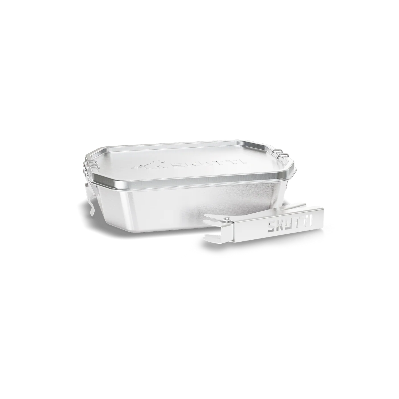Lítið box, 1 ltr., úr ryðfríu stáli með þéttu loki. Með boxinu fylgir töng til að geta notað boxið yfir hita.