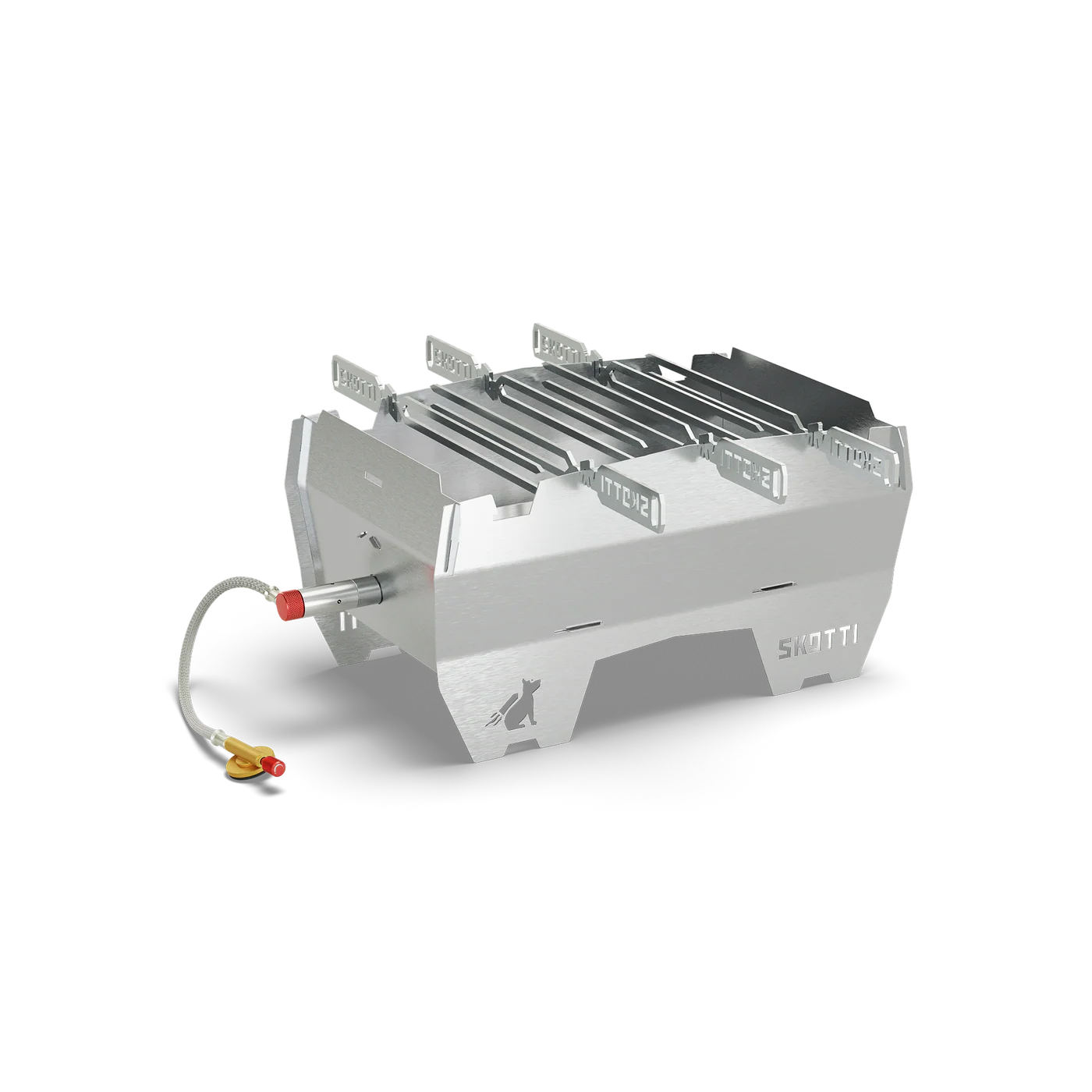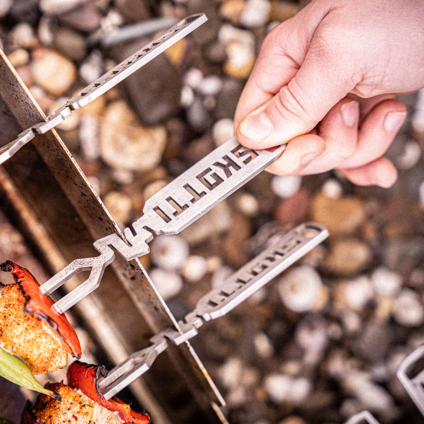 Grillspjót sem passa frábærlega með SKOTTI GRILL. Spjótin eru tvöföld til að hindra að maturinn snúist á þeim og eru þannig gerða að þau skorðast á hlið grillsins, annað hvort í láréttri stöðu eða með smá halla.